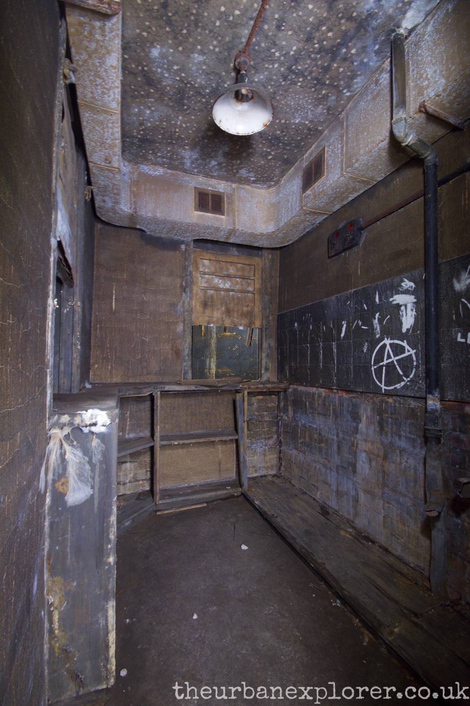 At the end of the tunnel you zig-zag in to the main operations corridor through thick, steel blast doors. Several rooms branch off each side of the passage, some more obvious than others to what they were once used for. A kitchen, toilets, sinks – all covered in a layer of soot (The ROTOR was victim of fire in the 60’s).